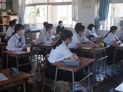 先ほどと同様に上の窓を換気用に少し開けています。授業は英語でした。先生も2年2組の生徒諸君もオールイングリッシュで授業をしていました。日本の学校じゃないみたいでした。